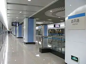 Siping Road (Chinese: 四平路; pinyin: Sìpíng Lù) is an interchange station between Lines 8 and 10 on the Shanghai Metro. It began operation on 29 December 2007. It became an interchange with Line 10 when it opened on 10 April 2010.