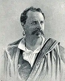 For the season of 1861–62, Santley returned to Covent Garden, opening in Howard Glover's Ruy Blas (as Don Sallust, Harrison as Ruy Blas), then in a re-cast version of Robin Hood, and finally in Balfe's The Puritan's Daughter. He also created the role of 'Danny Man' in Julius Benedict's The Lily of Killarney, which was performed nightly for five or six weeks. Worn out by this busy season, Santley decided to turn his attention to Italian opera, and, armed with a letter from Michael Costa, paid a visit to Rossini in Paris. This meeting proved disappointing; but he made an Italian début at Covent Garden in 1862 when he sang the role of di Luna in Il trovatore for three nights at Covent Garden, 'in place of Graziani, to oblige Mr. Gye':[19] that was with the English soprano Fanny Gordosa, Constance Nantier-Didiée, the Italian dramatic tenor Enrico Tamberlik and the Franco-Italian bass-baritone Joseph Tagliafico. Santley's performances were received rapturously by the Covent Garden audience.[2]
