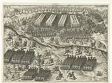 The following year he was back in the Low Countries and in January 1597 he made an important contribution to the victory of Turnhout, a rare pitched battle against the Spanish 'Tercios'. The English and Dutch cavalry having driven off the Spanish cavalry, then fell upon the disordered Spanish infantry who were then routed with heavy casualties.[9] Vere received a personal note from the Queen congratulating him on the victory, and he was even dramatised in London on the stage. The following year he was entrusted with the negotiation of the treaty whereby the Anglo-Dutch alliance was revised; for himself he obtained the governorship of Brill and the rank of general.[3]