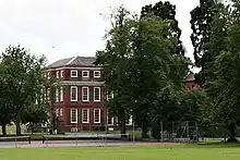 The Painted Parlour at Carshalton House is by Robert Robinson, a decorative painter and engraver who died in 1706. It therefore dates back to Edward Carlton's ownership. The Oak Parlour had an overmantel wooden carving of Fellowes's coat of arms.[26][27] Fellowes added the third storey of the house.[26] It has been described as "A large, solid block of nine by seven bays, built of yellow and red brick, with two storeys and an attic storey above the cornice".[28]