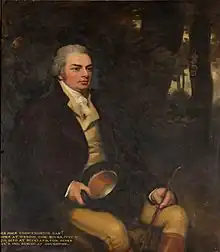 In c. 1795–1797 or 1811, Sir John's portrait was painted by Thomas Phillips, RA. The painting is a "three-quarter-length portrait" while Sir John is "in brown coat and buff breeches. He is seated in landscape holding his hat and stick and possibly wearing the Throckmorton coat."[8]