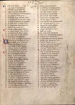 Sir Orfeo was probably written in the late 13th or early 14th century in the Westminster-Middlesex area.[2] It is preserved in three manuscripts: the oldest, Advocates 19.2.1, known as the Auchinleck MS. is dated about 1330; Harley 3810 is from about the beginning of the fifteenth century; and Ashmole 61 was compiled over the course of several years, the portion of the MS. containing Sir Orfeo dating around 1488. The beginning of the poem describes itself as a Breton lai and says it is derived from a no longer extant text, the Lai d'Orphey.