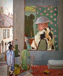 Orpen's 1910 self-portrait Leading the Life in the West has been read as a reference to the 1907 play The Playboy of the Western World, by John Millington Synge, whom Orpen knew and greatly liked.[6] During World War I, Orpen painted at least three self-portraits, that ranged from the optimistic tones of Ready to Start, in June 1917, to more sombre depictions painted only a few months later.[22][25] Bruce Arnold noted Orpen's interest in self-portraiture: his self-portraits are often searching and dramatic and seem to meet a deep personal need for frequent self-analysis.[5] He once painted himself as a jockey, and in his The Dead Ptarmigan – a self-portrait in the National Gallery of Ireland he scowls from the frame while holding a dead ptarmigan at head height. Orpen's later self-portraits were less successful. Writing in 2005, Kenneth McConkey attributed the shallowness of Orpen's later portraits to emotional exhaustion, resulting from his experience as a painter of war. He wrote of Orpen's post-war activity: