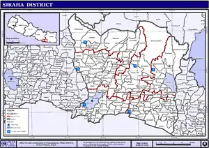 Siraha District (Nepali: सिराहा जिल्ला; Listen), a district in Madhesh Province, is one of the seventy-seven districts of Nepal. It is situated in the Terai belt of Nepal. The district, with Siraha as its district headquarters, covers an area of 1,188 km2 (459 sq mi). It has population of 637,328 according to census of 2011.The District is bordered with Saptari district in the east, Udayapur districting the north, Bihar state of India in the south and Dhanusa district in the west. Majority of the population here is Yadav, Tharus, Sahs(sahukar), Muslims and ethnic minorities with majority population speaking Maithili language and Nepali language.