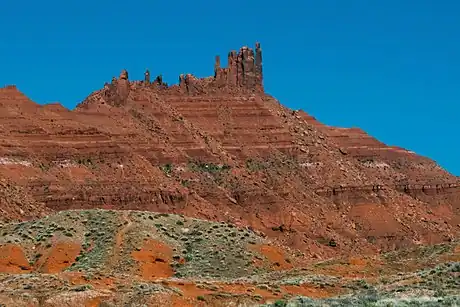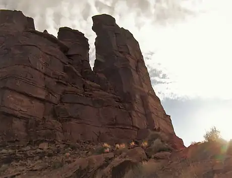 Sister Superior is a 6,037 ft elevation sandstone summit located southeast of The Convent in Grand County of Utah, United States. Sister Superior is located between Professor Valley and Castle Valley, near the city of Moab. It is situated east of Parriott Mesa and southwest of the Fisher Towers area. Remnants of an eroded butte,[3] Sister Superior is a thin tower with 300+ ft vertical Wingate Sandstone walls standing on a 1,000 foot Moenkopi-Chinle base. The nearest higher peak is The Rectory (6,565 ft), 1.2 miles (1.9 km) to the south. Further south along the connecting ridge is Castleton Tower. Precipitation runoff from Sister Superior drains into the nearby Colorado River. The first ascent was made May 17, 1965, by Harvey Carter and David Bentley.[4]