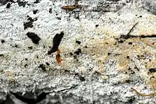 The membrane of this fungus is white and has waxy and soft texture when it is fresh. When it gets dry, it becomes pale cream and its texture gets ashy and brittle.[6] It is oxidase negative and the hyphae containing numerous clamps are oil-rich, contributing to its coarse granular appearance.[4][7] The mycelium of this fungus can cultivate on trama of Trametes hirsuta fruit bodies, as well as on wood-inhabiting basidiomycetes, with the help of a technique called "moisture gradient technique".[13]