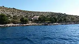 The coastline is not significantly indented, except for the bay Pahaljica (Čitapićev port) to the north of the island. Its middle width of 500 m consists of only one mountain ridge, where the highest elevation Veli vrh (84 m.a.s.l.) is located in the eastern part of the island, the central hill Vlašić is 78 m.a.s.l., and the northwest end Borovac is 60 m.a.s.l.[2]