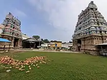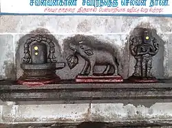 The present temple in the village dates back to the Later Chola period and covers an area of 1.3 acres (5,300 m2).[4] The principal shrine is dedicated to Shiva who is worshipped by a sculpted figurine of Vishnu in his Varaha Avatar.[4] There are also shrines dedicated to Subrahmanya, Gajalakshmi and Bhairava.[4]