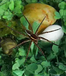 Around 10–14 days after mating occurs, female spiders produce egg sacs which they then transport within their mouths. Egg production can happen anytime between June and September and occasionally, but not often, in April.[4] Before hatching, the female builds a "nursery web" over vegetation and guards it.[15] The egg sac is placed among leaves to help keep it concealed. After the offspring have hatched, they sit under her protection in the web until they are ready to disperse into the outside world. The offspring leave the web about a week after they hatch.[7] Females exhibit intense defense of egg sacs, which are so strongly attached to the mouthparts that removing the egg sac from the mouthparts results in egg sac rupture. When boldness was measured as the time spent on the water's surface versus submerged (with more time on the surface seen as bolder), females were bolder during parental care and spent more time above water. This trend, while initially surprising, may reflect the energetic costs of staying underwater with an egg sac or developmental impediments when eggs stay underwater for extended periods of time.[16]