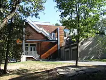 Similarly, the flat roofs that are typical of mid-century modern houses can be seen to be a disadvantage in a climate that routinely experiences large accumulations of snow, although this was somewhat mitigated by the introduction of new roofing materials.[22] A continuing interest in the relationship between buildings and the environment was displayed in later years by Sarah P. Harkness when she co-authored a study on the topic of sustainable design.[23] In a later interview, she continued to emphasize that architects needed to consider the whole environment as opposed to trying to design individual "star" buildings.[24]