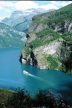 Skageflå is one of a handful of historic mountain farms on the steep mountainsides along the Geirangerfjorden. It is located in Stranda Municipality in Møre og Romsdal county, Norway. Skageflå lies approximately 250 metres (820 ft) above the fjord. The farm is a 2 to 4 hour walk from the nearby village of Geiranger, and can also be reached with help of a local sightseeing boat (M/S Geirangerfjord). The boat takes passengers to a spot on the fjord just below the farm, from where they face a very steep half-hour climb. Coastal Odyssey, a sea kayaking company, runs guided kayaking tours with interpretation to the farm. Active Geiranger also does guided kayak trips to the farm as well as water taxi trips to the trail. Directly across the fjord is the old Knivsflå farm and the Seven Sisters waterfall.[1][2]