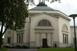 Named after its location, the church was built 1823-1849 to replace a minor wooden church on Blasieholmen destroyed in the devastating fire of 1822. Inaugurated by King Charles XIV John on 24 July 1842 and still officially carrying his name,[2] it was designed by the architect Fredrik Blom as a neoclassical octahedral temple inspired by the Pantheon in Rome, borrowing the coffered ceiling while substituting the oculus for the temple-shaped lantern light. On all sides, the plain white walls restored in 1998 are pierced by portals whose four pillars support semi-circular lunettes. Inside the cruciform exterior, the interior sheet of the wooden double cupola is supported by paired doric columns and rounded arches. Accompanying the painted altarpiece are niches with statues of the apostles and two plaster groups.