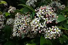 Skimmia is a genus of four species of evergreen dioecious shrubs and small trees in the rue family Rutaceae, all native to warm temperate regions of Asia. The leaves are clustered at the ends of the shoots, simple, lanceolate, 6–21 cm long and 2–5 cm broad, with a smooth margin. The flowers are in dense panicle clusters, each flower small, 6–15 mm diameter, with 4-7 petals. The fruit is red to black, 6–12 mm diameter, a fleshy drupe containing a single seed. All parts of the plant have a pungent aroma when crushed.[1] The botanical name Skimmia is a Latinization of shikimi (シキミ, 樒), which is the Japanese name for Illicium religiosum as well as an element in miyama shikimi (ミヤマシキミ, 深山樒), the Japanese name for Skimmia japonica.