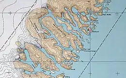 There are remains of relatively recent abandoned Inuit dwellings inside the fjord on Skjoldungen's western shore. These date back to 1938 when one hundred and fifty Inuit from Ammassalik were convinced by the Danish authorities to settle in this large island. During World War II a weather station was built and run by the Allies on Skjoldungen, as well as another one on Cape Adelaer further south down the coast at 61°50′N 42°5′W / 61.833°N 42.083°W.[13] The inhabitants of the Inuit settlement were relocated in 1965 following a nationwide program to concentrate the population of Greenland in a few larger towns.[14] Another reason was that fishing and hunting were not enough to keep the population even close to a state of self-sufficiency.[15]