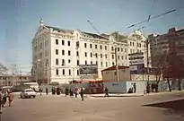 The mill successfully continued to work during the years of the Soviet occupation.[8] In 1987, it suspended its activities and was transferred to the balance of the Union of Artists of Azerbaijan.[1] In 1996, the abandoned and vacant building was bought by an entrepreneur. After the renovation, during which the outbuildings in the courtyard were demolished and the interior was renovated, it turned into a business centre. [2] Later, a round building (rotunda) was built in its courtyard, and a zone of green spaces was created around it. Over the years, new buildings of office and hotel type were added to the complex called Landmark. In 2002, a 9-storey building was constructed, and in 2010, a 22-storey one. Inside the complex's buildings there are various restaurants, hotels, conference rooms, offices of a number of foreign and local organizations and embassies. [2]