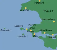 Skokholm (Welsh: Ynys Sgogwm) or Skokholm Island[1] is an island 2.5 miles (4.0 km) off the coast of Pembrokeshire, Wales, south of the neighbouring island of Skomer.[2][3] The surrounding waters are a marine reserve and all are part of the Pembrokeshire Coast National Park. Both islands are listed as Sites of Special Scientific Interest.
