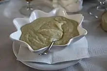 Skordalia or skordhalia or skorthalia (Greek: σκορδαλιά [skorðaˈʎa], also called αλιάδα, aliada/aliatha), or tarator in Turkish, is a thick purée in Greek cuisine and Turkish cuisine, made of garlic in a base of potatoes, walnuts, almonds or liquid-soaked stale bread mixed with olive oil in to make a smooth emulsion, to which some vinegar is added.[1][2] It is usually made in a mortar and pestle. Skordalia is served as a sauce, side dish, or dip.