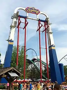Skyhawk is a Screamin' Swing type ride built by S&S Worldwide. The structure itself is 103 feet (31 m) tall at its highest point, the equivalent height of a ten-story building. It consists of two swinging arms, both 84 feet (26 m) tall, seating 20 across and 20 back to back (40 total).[1] At full swing, the ends of the arms approach 125 feet (38 m) high off the ground—as high as a twelve-story building—and achieve a maximum velocity of 65 miles-per-hour—faster than most wooden roller coasters. The ride lasts about one minute, and can accommodate 800 passengers per hour. Riders must be 48 inches (1,200 mm) or taller.[2] Riders are restrained by a lap bar.[3]