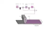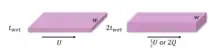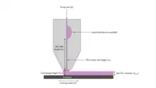 Slot-die coating operates via a pre-metered liquid coating mechanism. The thickness of the wet coated layer () is therefore significantly determined by the width of coating (), the volumetric pump rate (), and the coating speed, or relative speed between the slot-die and the substrate during coating ().[28][25] Increasing the pump rate increases the thickness of the wet layer, while increasing the coating speed or coating width decreases the wet layer thickness. The coating width is typically a fixed value for a given slot-die process. Hence, pump rate and coating speed can be used to calculate, control, and adjust the wet film thickness in a highly predictable manner. However, deviation from this idealized relationship can occur in practice due to non-ideal behavior of materials and process components; for example when using highly viscoelastic fluids, or a sub-optimal process setup where fluid creeps up the slot-die component rather than transferring fully to the substrate.