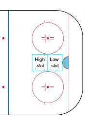 In hockey, the slot is the area on the hockey rink directly in front of the goaltender between the faceoff circles and extending to the top of the face off circles. It is sometimes referred to as the "scoring area".