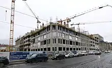 The first stage of construction will be the primarily residential section between Za Ženskými Domovy, Nádražní, and Stroupežníckého Streets as well as the extension of Na Valentince Street. The area will be turned into two blocks connected by a pedestrian zone. The first block will comprise the Na Knížecí administrative building and a compound made of nine residential buildings, while the second block will comprise a compound with nine residential buildings. This section will include a total of 400 apartments with underground garages and inner courtyards with gardens.[13] Stage 1 will be approximately 27,000 m² in area and will see 3 billion CZK in investment. Construction began in September 2020. The construction of Stage 1 will be carried out by a consortium comprising Strabag, Aspira Construction, and Instalace Praha. The first 195 apartments and the Na Knížecí administrative building will be completed within two years.[14][15]