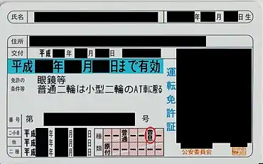 | Ordinary motorcycle | 普通自動二輪車 | Any motorcycle with engine displacement over 50 cc but no more than 400 cc. |