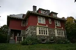 The Smith–Ballou House was constructed in 1906 for two elderly sisters, Mary F. Smith (née Ballou) and Sarah J. Ballou. This 5,000-square-foot (460 m2), three-story house combines Queen Anne and Arts & Crafts style influences, and retains a high degree of integrity of both design and materials. In the first 100 years, the house was owned and occupied by five families. The house initially stood on 5 acres (20,000 m2) of land, subdivided in 1938 such that the house now stands on approximately two acres.[2]