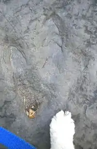 The area's igneous activity from the Jurassic period has left a landscape of Holyoke and black-rock diabase in and around Mt. Tom, the former being created by surface lava flow and the latter as it was forced through layers of subterranean sandstone where it became deposited as an igneous mass. Basalt also occurs in the area due to the former volcanic activity. Sedimentary rocks abut the igneous deposits with large swaths of arkosic sandstone extant along the banks of the Connecticut River.[19] It is on this sandstone that dinosaur tracks from Early Jurassic can be found. These tracks were once so prevalent that they could be readily found by land-owners who would often chisel them away from the landscape and sell them to tourists. Construction of I-91 along Mt. Tom was briefly delayed in the mid-1960s when several slabs of dinosaurs were discovered from blasting in the area.[20]
