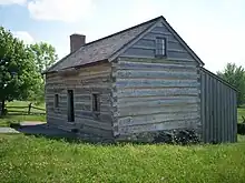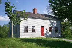 Joseph Smith Sr., his wife Lucy Mack Smith, and some of their children moved from Norwich, Vermont, to Palmyra, New York, in 1816.[5] In 1818 or 1819, the family built a log home near property owned by the estate of Nicholas Evertson of New York City, but did not enter a purchase agreement for the land until a land agent had been appointed in 1820. Smith, Sr. agreed to pay the Evertson estate between $600 and 700 for the 100-acre (0.4 km2) farm.[6] In 1825, the family moved into a larger and more comfortable frame home that they had built on the property but were unable to make payments on the land. A carpenter who had completed the house sued the Smiths for his costs in February 1825. A new agent for the Evertson estate also foreclosed on them, although a sympathetic Quaker, Lemuel Durfee, purchased the farm and permitted the family to rent the frame house until they returned to the log home in the spring of 1829. The Smiths left the area in 1830.[7][8]