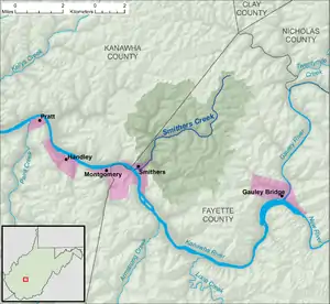 Smithers Creek is a tributary of the Kanawha River, 7 miles (11 km) long,[3] in southern West Virginia in the United States. Via the Kanawha and Ohio rivers, it is part of the watershed of the Mississippi River, draining an area of 18.1 square miles (47 km2)[4] on the unglaciated portion of the Allegheny Plateau. The creek flows for its entire length in western Fayette County; its tributaries additionally drain a portion of eastern Kanawha County.