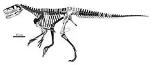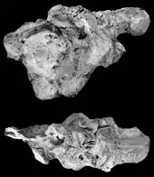 Smok was found in a locality near Lisowice village that is latest Norian to early Rhaetian in age. This area was known to contain Triassic fossils since it was formally described in 2008. The first material of Smok, the jawbone and fragments of the skull, was discovered in 2007. It was first described in 2008 as a theropod dinosaur based on features in its braincase and frontal bone. The material was also thought to represent two individuals.[2] Similarities were noted between the braincase of the animal and that of allosauroids. When the discovery was first announced, it was called "the Dragon of Lisowice" and was purported to be the first member of a line of dinosaurs that led to Tyrannosaurus rex.[3] Bones from other parts of the body were found in 2009 and 2010. Five tracks made by a three-toed archosaur – presumably a theropod dinosaur – were found in rocks that were 1 metre (3.3 ft) above the layer where Smok was found. The footprints may belong to Smok, but the lack of foot bones in the skeleton make this association uncertain.[1]