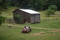 About two miles downstream of the entrance, the river bifurcates to create the low-lying Hermit Island (4.5 acres), formerly a popular picnicking ground and site of a two-storey log cabin that served as a community center ("Calhoun's Community Camp") from 1928.[5] Almost directly across the river, and high on the hillside, is the Canyon's namesake, Smoke Hole Cave. Passing on down the river, one encounters Fishing Rock and Fishing Rock Ford and finally comes, at 3.8 miles from the entrance, to an intersection near Shreve's Country Store, Smoke Hole Campground and the old Palestine Church ("Old Log Church"). This area was the center of the "town of Smoke Hole" proper, site of an official post office for a time. From here a steep Forest Service road switchbacks 5.4 miles up to the former site of the North Fork Mountain Lookout Tower. Grant County Route 28/11 also proceeds from this intersection and traverses the northern half of the Canyon well above the river level for about 12 miles (19 km) where it exits the Canyon at WV Route 55/28. (NB: Both Grant County Route 28/11 and Pendleton County Route 2 are indicated on maps as "Smoke Hole Road". The former was previously called FR 74.)