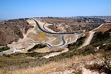 Construction of a border fence by the United States Border Patrol, made of corrugated landing strips, in the area of Smuggler's Gulch began in 1990, and was completed in 1993;[37][lower-alpha 2] this fence was not opposed by environmentalist, as it reduced trampling of habitat and egg consumption by illegal aliens.[39] In 1996, the United States Congress approved construction of double fencing from the Pacific Ocean to 14 miles (23 km) inland along the Mexico–United States Border.[40] Due to this apprehension of illegal immigrants were significantly reduced, and shifted where illegal entry occurred to places without double fencing, including Smuggler's Gulch.[41] In 2002, a Border Patrol agent died when her vehicle toppled down the gulch's steep slopes;[27] this was one of four deaths that were attributed to narrow switchback roads which existed on the canyon walls.[42][lower-alpha 3] In February 2004, the California Coastal Commission halted construction of the Mexico–United States barrier, asking the United States federal government to make additional environmental concessions in regards to border barrier construction;[44] this action was criticized in The American Spectator.[45] Beginning in 2005, environmental laws were waived, as authorized by the Real ID Act, in order for the Mexico–United States barrier to be built in the gulch and in nearby Goat Canyon.[27][44] These proposed actions were criticized by various people and organizations, including the Sierra Club.[9][46][47] In 2005, 127,000 illegal aliens were apprehended in the area of Smuggler's Gulch, overcoming the existing fencing.[38] In August 2008, barrier construction in the gulch began;[40] work was contracted to Kiewit Corporation.[48]