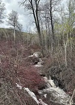 Snake Creek originates on the southeastern slope of Sunset Peak, about 3 miles (4.8 km) south of Brighton.[6] and flows southeast through Snake Creek Canyon, receiving Lavina Creek (from the left heading downstream) and other minor tributaries until it receives Pine Creek at the base on the canyon in Wasatch Mountain State Park. Pine Creek, in turns descends along North Pine Canyon Road and is paralleled by the WOW (Wasatch over Wasatch) Trail. From here Snake Creek flows southward through the city of Midway on the western edge of the Heber Valley. After passing south of Midway, Snake Creek reaches its confluence with the middle section of the Provo River, just above Deer Creek Reservoir.