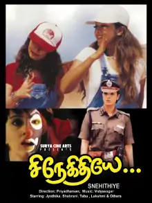 Snegithiye (transl. Oh (female) friend!) is a 2000 Tamil-language mystery thriller film directed by Priyadarshan. The film notably features only female characters, played by Tabu, Jyothika, Sharbani Mukherjee and Ishitta Arun. Music was composed by Vidyasagar. The film, released in 2000, proved to be an average grosser at the box office but bagged positive reviews from critics.[1] Originally planned to be made as a bilingual, in Tamil and in Malayalam, the film released first in Tamil only, while the Malayalam version, Raakilipattu, as well as the dubbed Hindi version, Friendship, released seven years later.[2] The film's story is loosely based on the 1999 Marathi film Bindhaast written by Chandrakant Kulkarni.