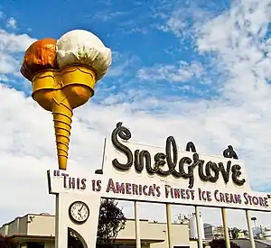 Snelgrove ice cream parlors were located in various locations in the Salt Lake area and in other Utah communities. The largest of these was the flagship store located at 850 East 2100 South, in the Sugar House neighborhood of Salt Lake City, but it was torn down to make way for other developments in March 2021. The decor and architecture of the store was art deco. The store's look was enhanced with a 40-foot-wide sign (12 m) from the early 1960s, with the name Snelgrove in large looping cursive neon letters, and a spinning giant double cone. The factory producing Snelgrove Ice Cream is located directly behind this store. The next oldest location was the Snelgrove store on East South Temple in downtown Salt Lake City.
