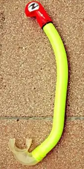 A snorkel is a device used for breathing atmospheric air when the wearer's head is face downwards in the water with the mouth and the nose submerged. It may be either a separate unit, or integrated into a swimming or diving mask. The integrated version is only suitable for surface snorkeling, while the separate device may also be used for underwater activities such as spearfishing, freediving, finswimming, underwater hockey, underwater rugby and for surface breathing while wearing scuba equipment. A standard snorkel is a curved tube with a shape usually resembling the letter "L" or "J", fitted with a mouthpiece at the lower end and made from plastic, synthetic elastomers, rubber, or light metal.[1] The snorkel may have a loop or a clip to attach it to the head strap of the diving mask or swimming goggles, or may be tucked between the mask-strap and the head.[2] Some snorkels are fitted with a float valve at the top to prevent flooding if the top opening is immersed, and some are fitted with a water trap and purge valve, intended for draining water from the tube.