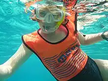The most common swimming aids used by snorkellers are swimfins. A snorkelling vest may be used for buoyancy.