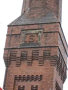 The chimney is reinforced with wrought iron bands and has dated terracotta panels, engraved with the letter "S" denoting the Soames Brewery. These terracotta panels are incorporated into a corbelled chamber surmounting, on a high base with recessed panels. The chimney is highly ornamented, and this ornamentation is hypothesied to be a potential tribute to the owner's father who died in the same year as the chimney's construction in 1894. Below the panels is an octagonal shaft which terminates with a moulded projecting stone cornice and cap.[2][5]