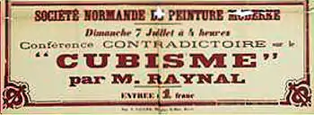 During the exhibition, on June 23, a paper was presented by Guillaume Apollinaire, entitled Le sublime modern. On Sunday, July 7 the art critic Maurice Raynal gave a lecture on Cubism. The entrance fee was 1 FF.[10]