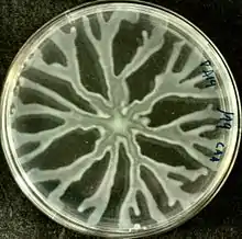 Swarming motility is the coordinated movement of bacteria along a solid/semisolid surface. Swarming motility can usually be observed in a laboratory setting, depending on the conditions of media nutrient concentration, and the viscosity of the surface of the media. More information on swarming motility can be found here.[6]