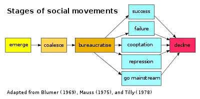 The declining of a social movement does not necessarily mean failure. There are multiple routes in which a movement may take before proceeding into decline. Success of a movement would result in permanent changes within the society and/or government that would result in a loss of need for protest. Failure is often the result of the incapability to keep a common focus, and work towards the goal in mind. "Failure of social movements due to organizational or strategic failings is common for many organizations".[43] Such a route would result in the gradual breaking up of an organization, and out of the stages of movement. Co-optation results when people or groups are integrated and shift away from the social movement's initial concerns and values. Repression is another example, when the movement is slowly wiped away from the public platform through means of an outside force, usually being the government. The last route into declining is going mainstream, which is generally perceived as an overall success. This is when goals of the movement are taken into society as a part of daily life, making it a 'social norm.' For example, birth control is still a greatly debated topic on a government level, but it has been accepted into social life as a common thing that exists.
