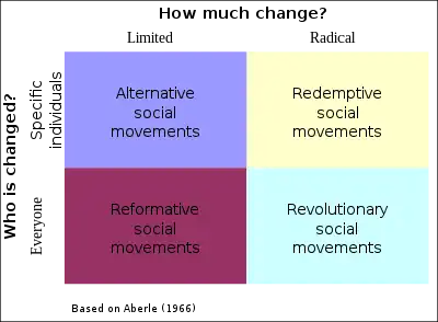 - group-focus movements - focused on affecting groups or society in general, for example, advocating the change of the political system. Some of these groups transform into or join a political party, but many remain outside the reformist party political system.