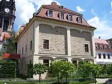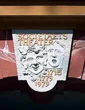 The building was not destroyed in the bombing of Dresden on 13 February 1945, but fell into increasing disrepair after the war. In the 1950s and 60s, urgently needed repairs were not made, and from the 1970s on, the building was abandoned. Despite the renovation of the Hauptstraße beginning in 1978, the intention was to gut and demolish the building.[18] The architect Jürgen Mehlhorn, who had become interested in the building while still a student and was now using it to store material for the reconstruction of other buildings on the street, in 1979 designed a keystone for the main entrance at Hauptstraße 19 depicting two theatrical masks and with the inscription "Societaetstheater 1715 1779 1979".[18] The association "Interessengemeinschaft Societaetstheater" was then founded; in 1992 this became "Societaetstheater e.V." The association worked to preserve the building and raised money for urgent repairs such as roof work and provisional safety measures. In 1985, the building became a registered landmark of the German Democratic Republic.[19] More extensive repairs were made in 1989. After German reunification in 1990, Dresdner Bank sponsored the building's restoration. The Dresden city council decided in October 1994 that the theatre would be operated by the city once restored, and work began in 1996.