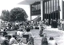 Phillip Abbott Luce speaks in front of the California State University, Fullerton (CSUF) library on March 22, 1974.