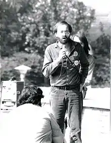 Lawrence Samuels, founder of SLL, speaking against state Senator Brigg's anti-gay measure (Prop. 6) before the evening debate between John Briggs and Eric Garris on October 26, 1978.