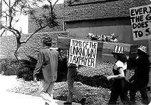 For over a decade, SLL organized annual anti-tax demonstrations in Southern California. One of the largest occurred in 1976 in downtown Santa Ana, California, along with the Libertarian Party. Protesters staged a "mock funeral, complete with coffin and flowers" which represented the "Tomb of the Unknown Taxpayer."[23] According to news reports, Karl Bray, a famous tax resister who had been imprisoned at Terminal Island was denied bail "to prevent him from attending" or speaking at the anti-tax rally.[24] Karl Bray's wife spoke in behalf of her husband.[25] The rally coincided with National Tax Protest Day.