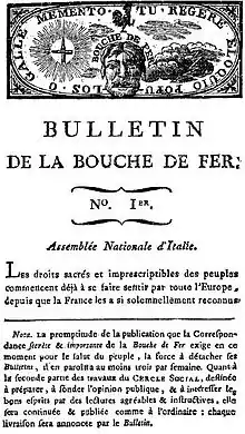 La Bouche de fer, the Mouth of Iron, may have derived its name, sardonically, from Lucius Licinius Crassus's observation about the consul, Domitius, "that it was no wonder that a man who had a beard of brass, also had a mouth of iron and a heart of lead."[3][4][5][6] Others hold that the name comes from a mailbox in the shape of a lion's mouth, located at the headquarters of the club, at No. 4, rue du Théâtre-Français, where letters, petitions, proposals, denunciations, screeds, and other treatises could be deposited. A third theory is that this name, Mouth of Iron, was the same name as a lodge of freemasons to which Bonneville and Fauchet had once belonged.[7]