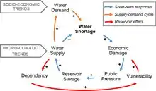 Evidence has shown that water supply leads to higher water demand, which can quickly offset the initial benefits of reservoirs. These cycles can be seen as a rebound effect, also known in environmental economics as Jevon's paradox: as more water is available, water consumption tends to increase. This can result in a vicious cycle: a new water shortage can be addressed by further expansion of reservoir storage to increase water availability, which enables more water consumption, which then can potentially lead to conditions of water scarcity. As such, the supply-demand cycle can trigger an accelerating spiral towards unsustainable exploitation of water resources and environmental degradation.[13]