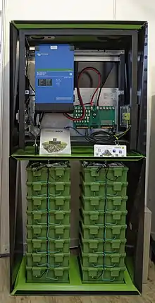 Faradion Limited is a subsidiary of India's Reliance Industries.[69] Its cell design uses oxide cathodes with hard carbon anode and a liquid electrolyte. Their pouch cells have energy densities comparable to commercial Li-ion batteries (160 Wh/kg at cell-level) with good rate performance till 3C and cycle lives of 300 (100% depth of discharge) to over 1,000 cycles (80% depth of discharge). Its battery packs have demonstrated use for e-bike and e-scooter applications.[34] They demonstrated transporting sodium-ion cells in the shorted state (at 0 V), eliminating risks from commercial transport of such cells.[70] It is partnering with AMTE Power plc[71] (formerly known as AGM Batteries Limited).[72][73][74][75]